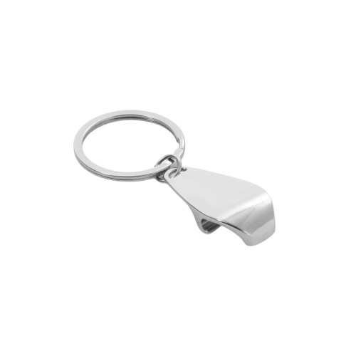 Chaveiro em metal com abridor de garrafas. 22 x 42 x 9 mm.