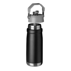 Garrafa em aço inox com capacidade de até 780 ml. Tampa rosqueável, mosquetão em plástico e anel de silicone para vedação. Design com frisos na tampa e pintura pó. Dimensão Produto: 23 x 7,3 cm